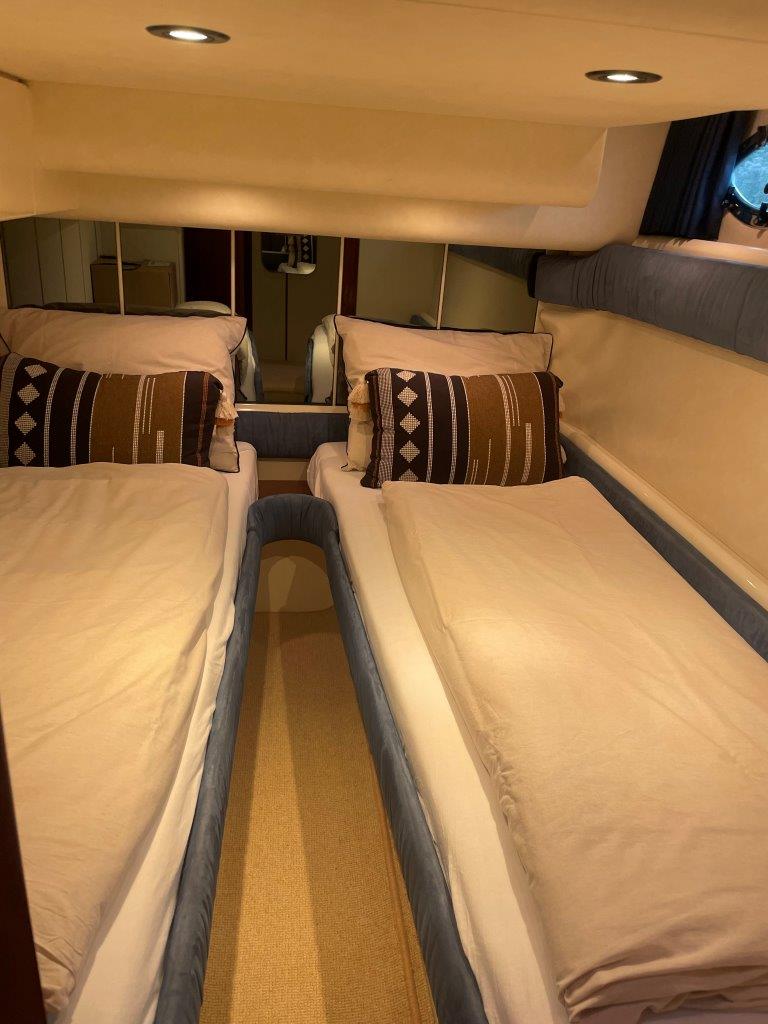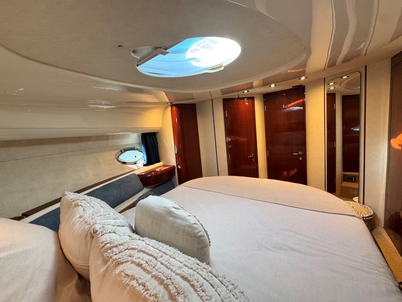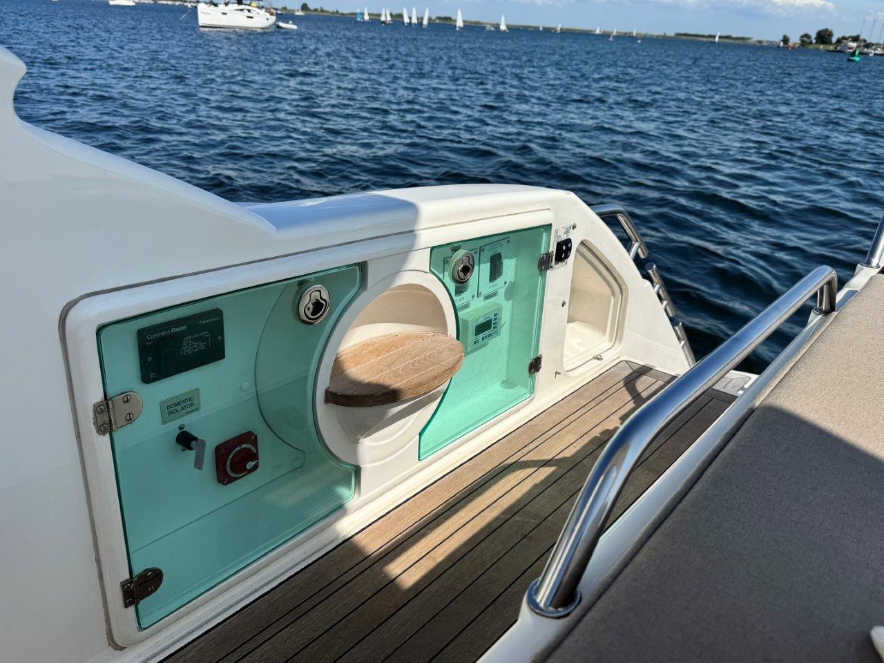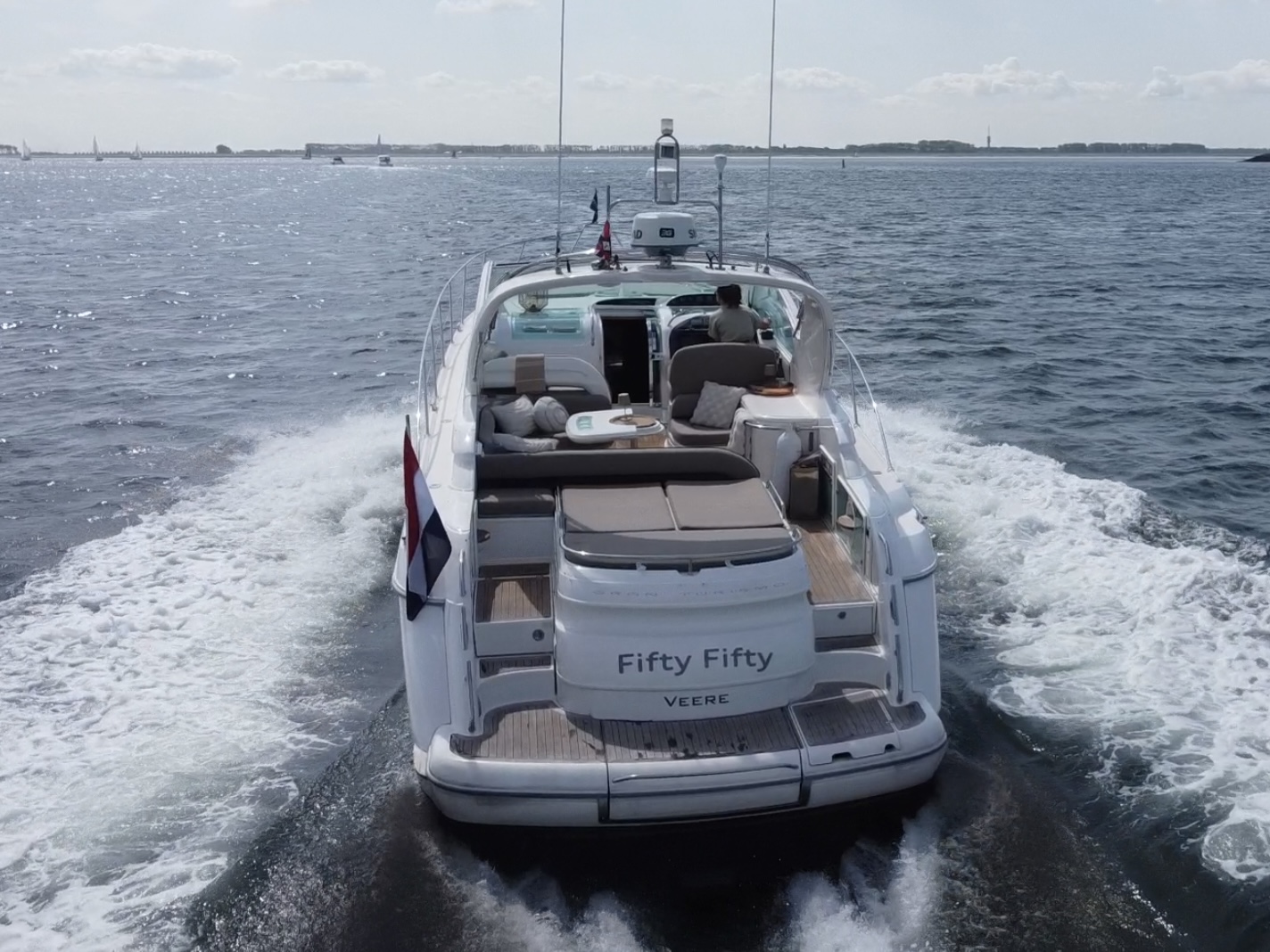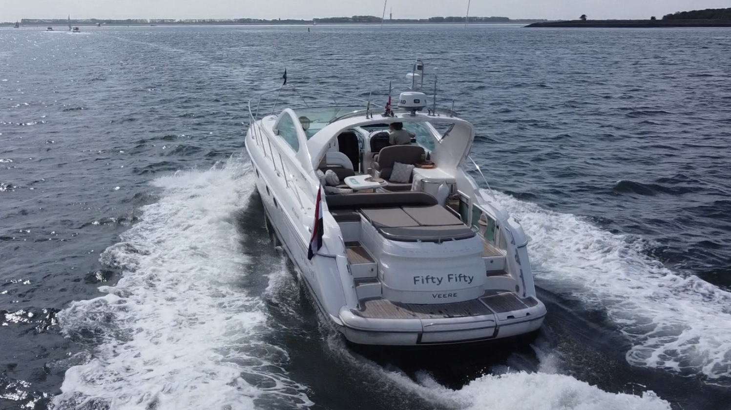 ‘Fifty Fifty’ is een plaatje van een Targa 48 en één van de weinige met een witte romp. Met haar 3 slaapkamers en 2 badkamers is het goed toeven aan boord.