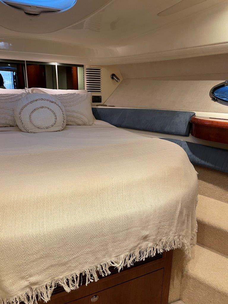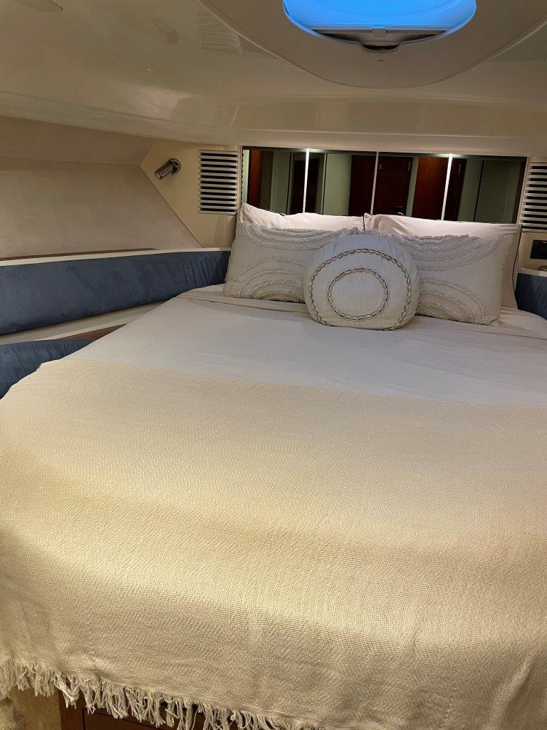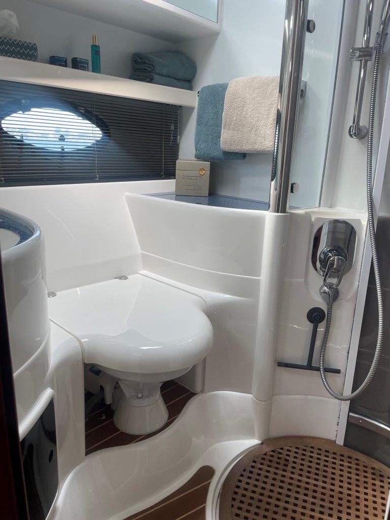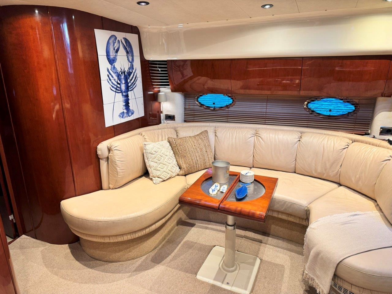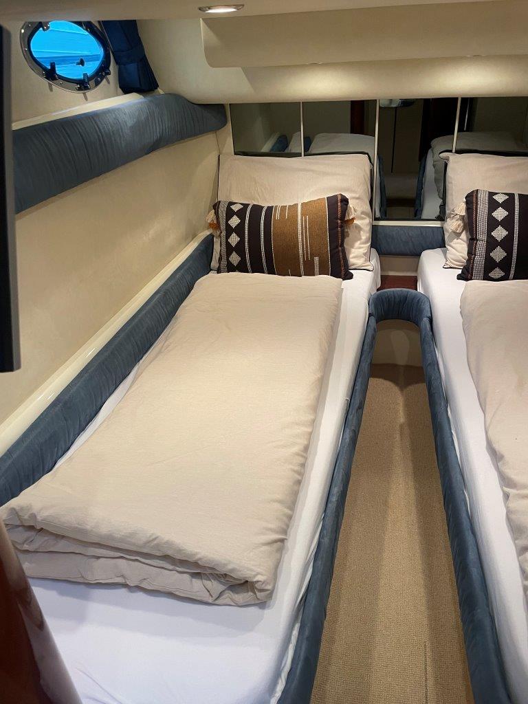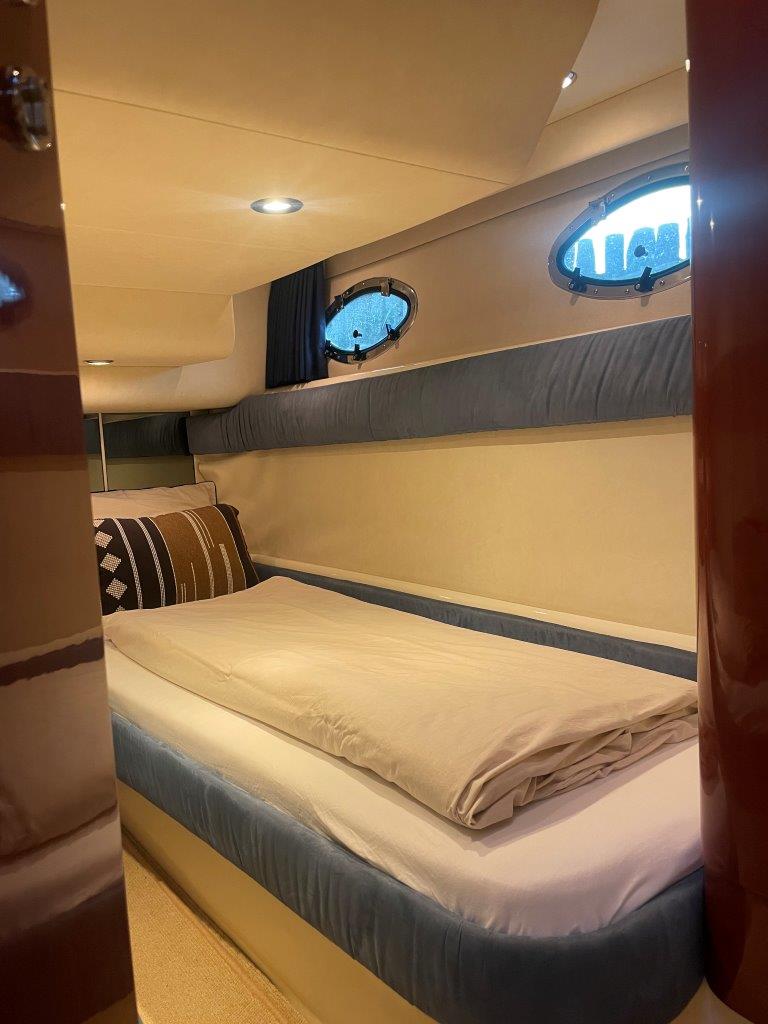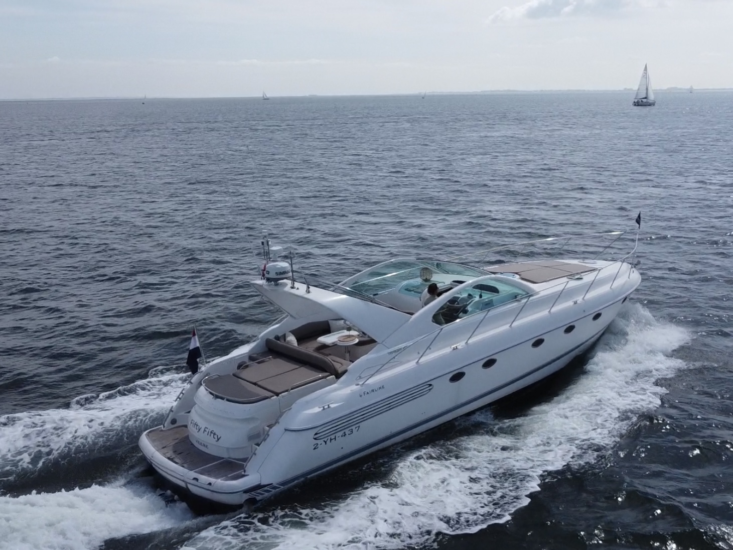 ‘Fifty Fifty’ is een plaatje van een Targa 48 en één van de weinige met een witte romp. Met haar 3 slaapkamers en 2 badkamers is het goed toeven aan boord.