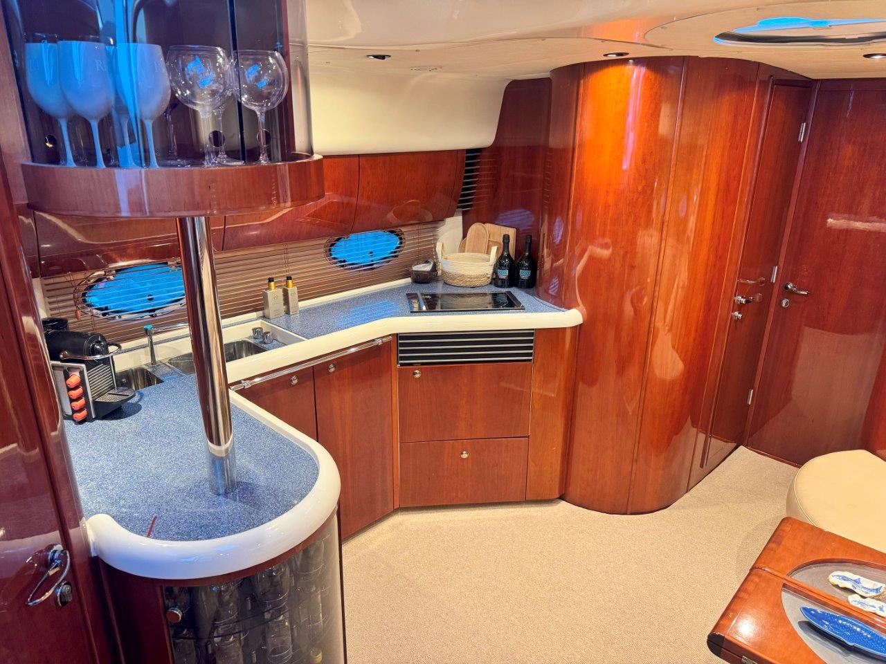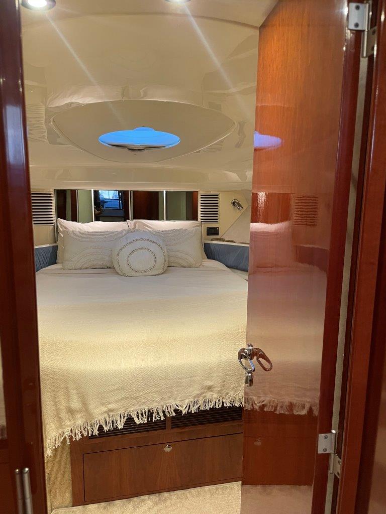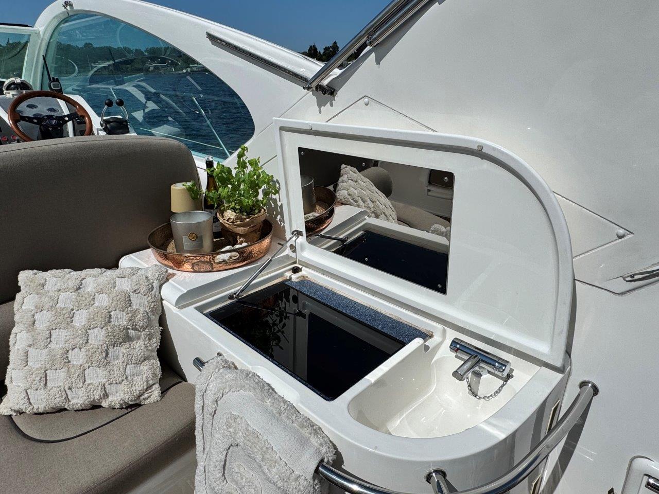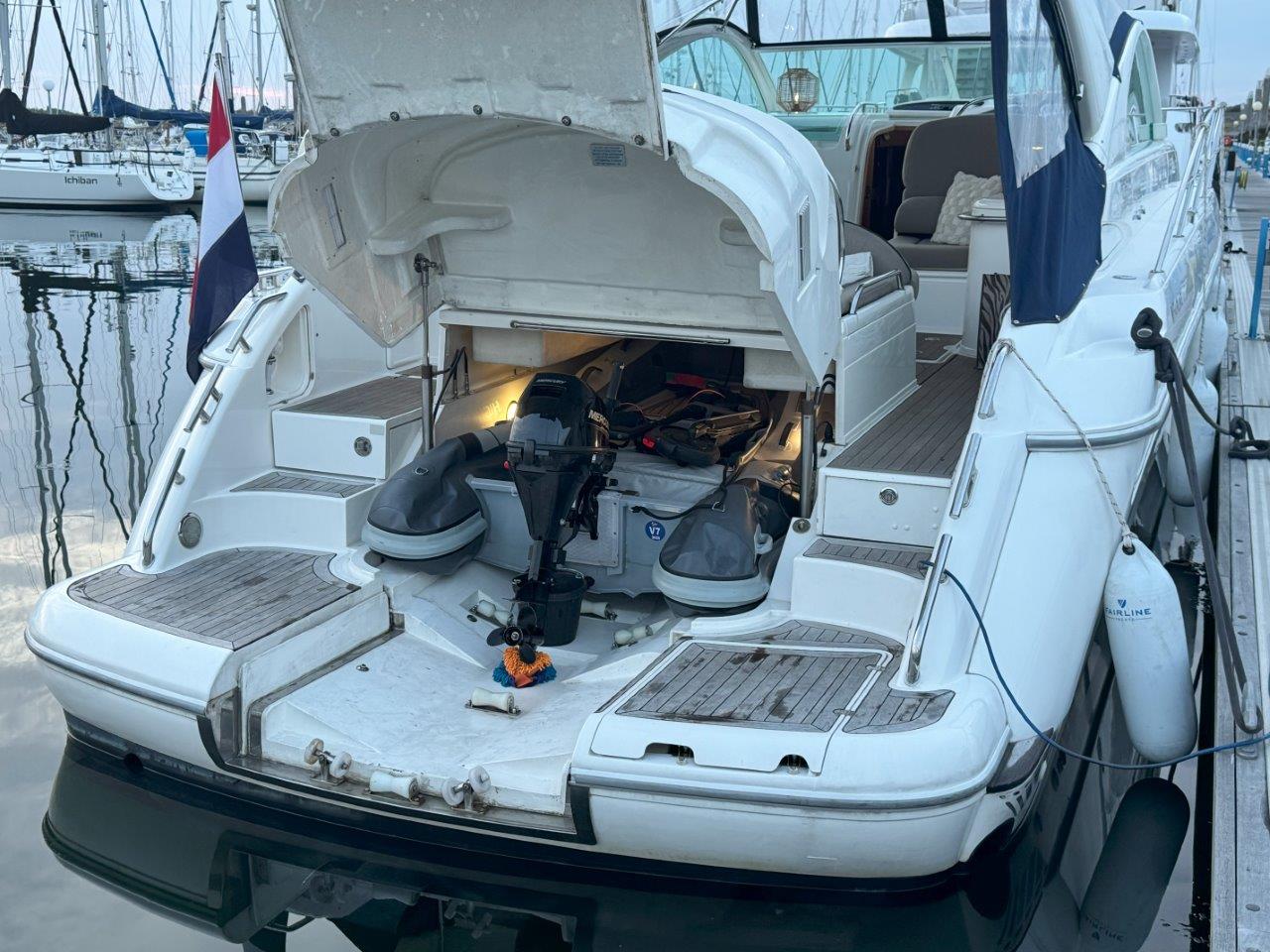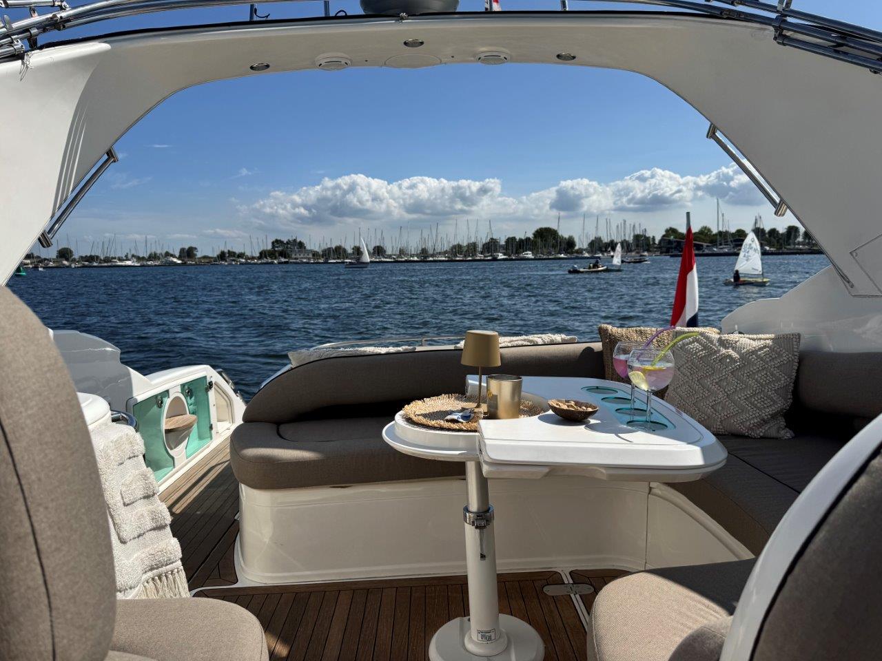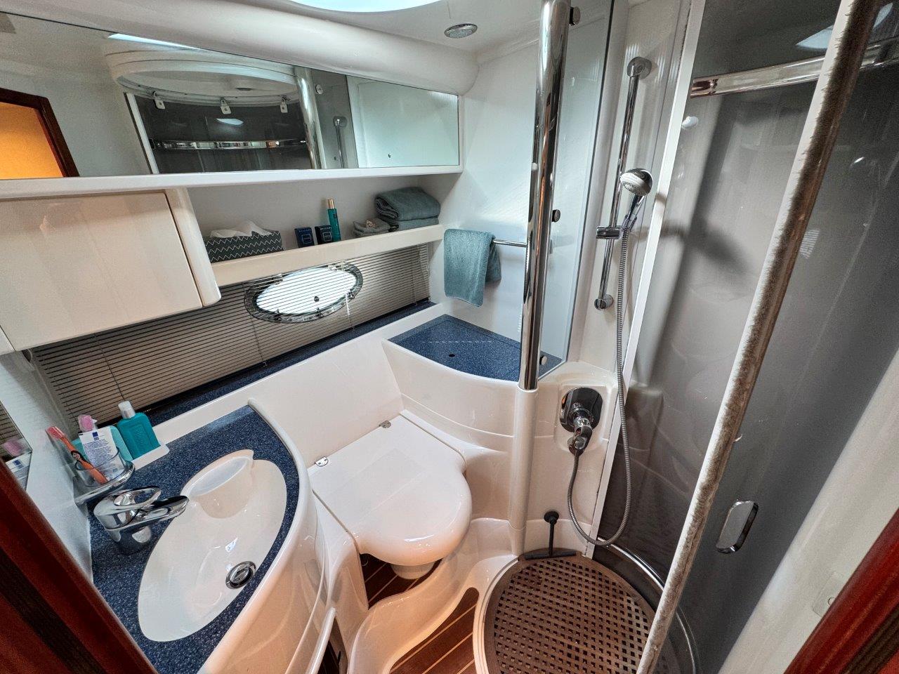 ‘Fifty Fifty’ is een plaatje van een Targa 48 en één van de weinige met een witte romp. Met haar 3 slaapkamers en 2 badkamers is het goed toeven aan boord.