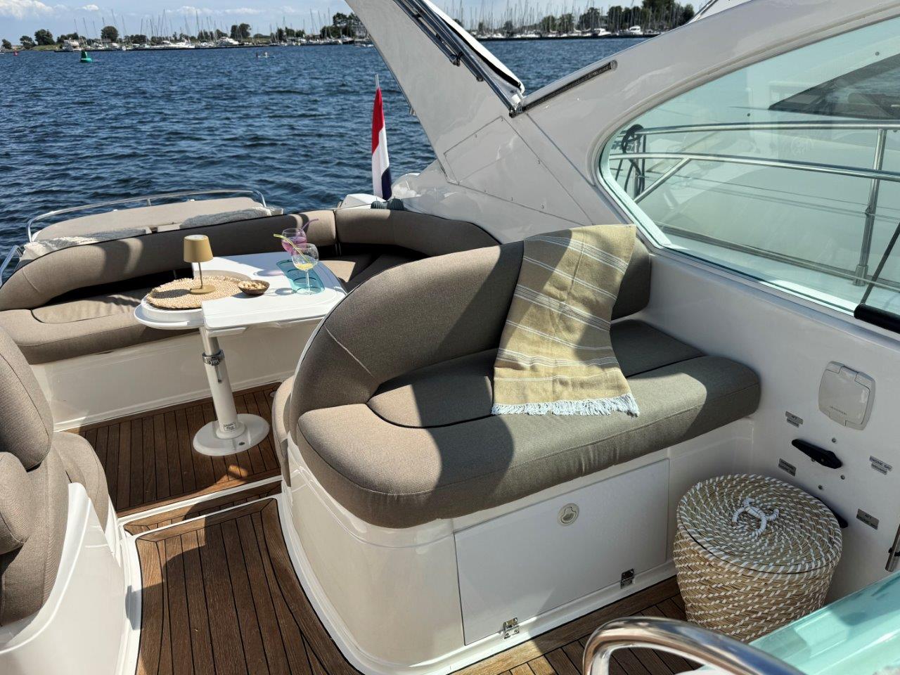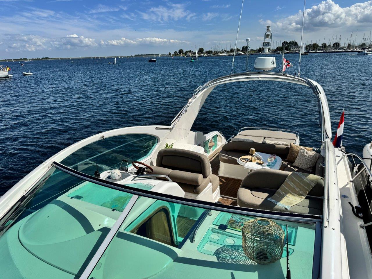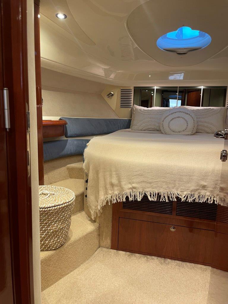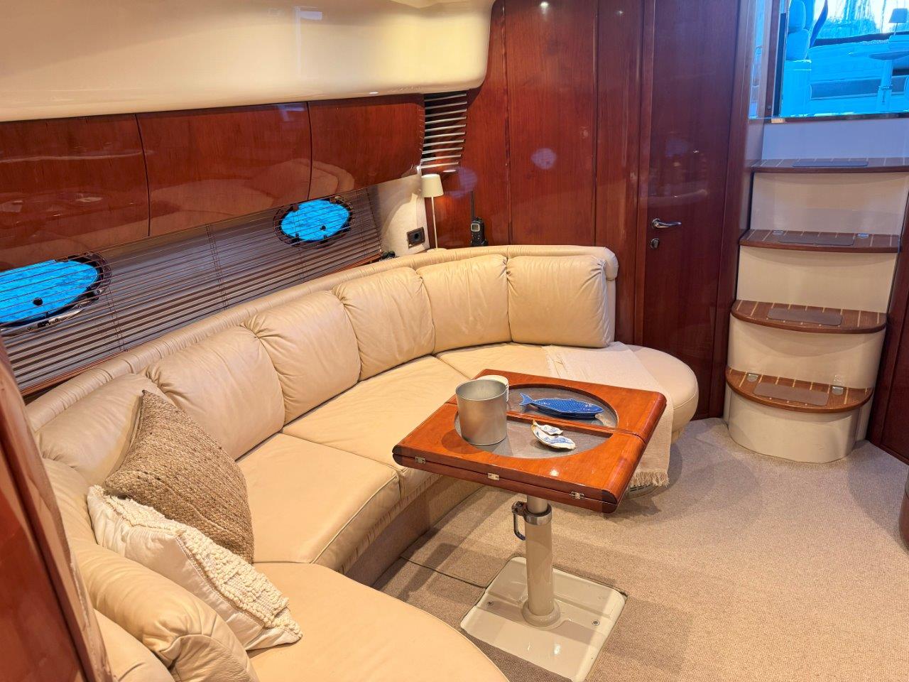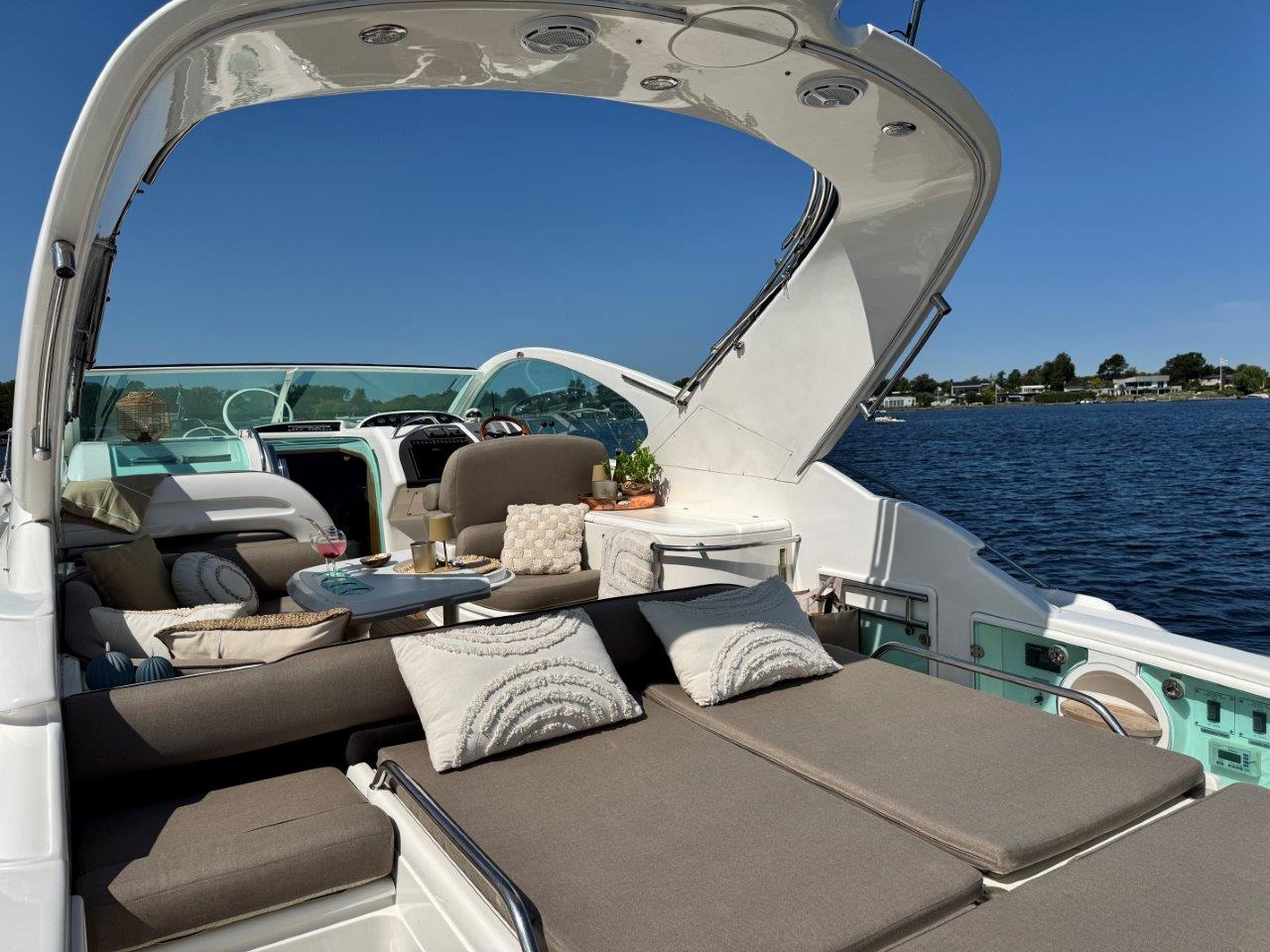 ‘Fifty Fifty’ is een plaatje van een Targa 48 en één van de weinige met een witte romp. Met haar 3 slaapkamers en 2 badkamers is het goed toeven aan boord.
